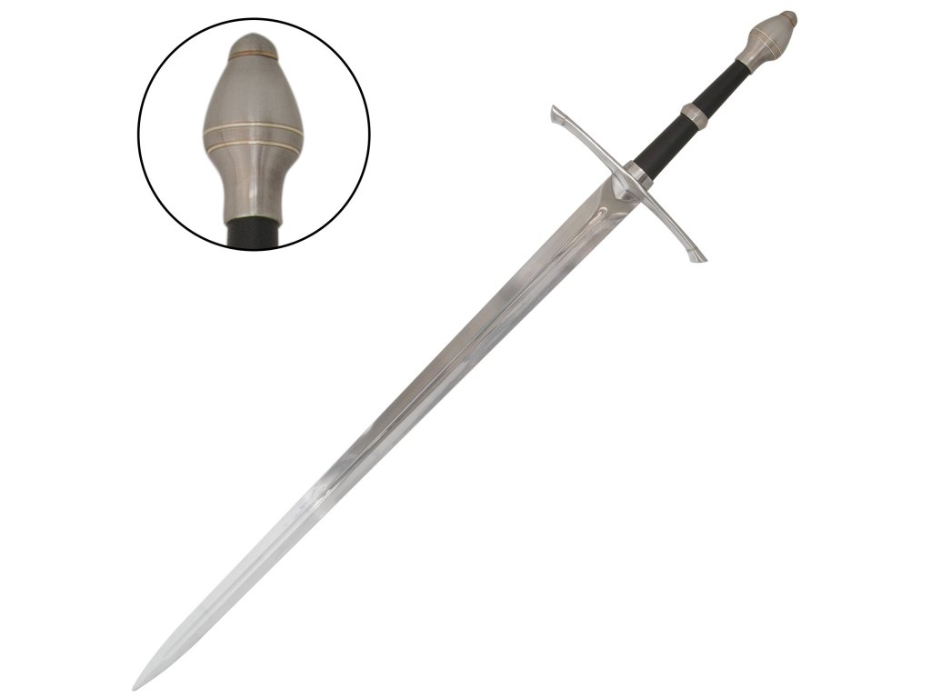 Tento impozantní jedenapůlruční meč se pyšní charakteristickou téčkovou záštitou, elegantní černou rukojetí a výraznou gotickou hruškou. Jeho nebroušená ocelová čepel se žlabem, dlouhá 880 mm, je perfektní pro vystavení.