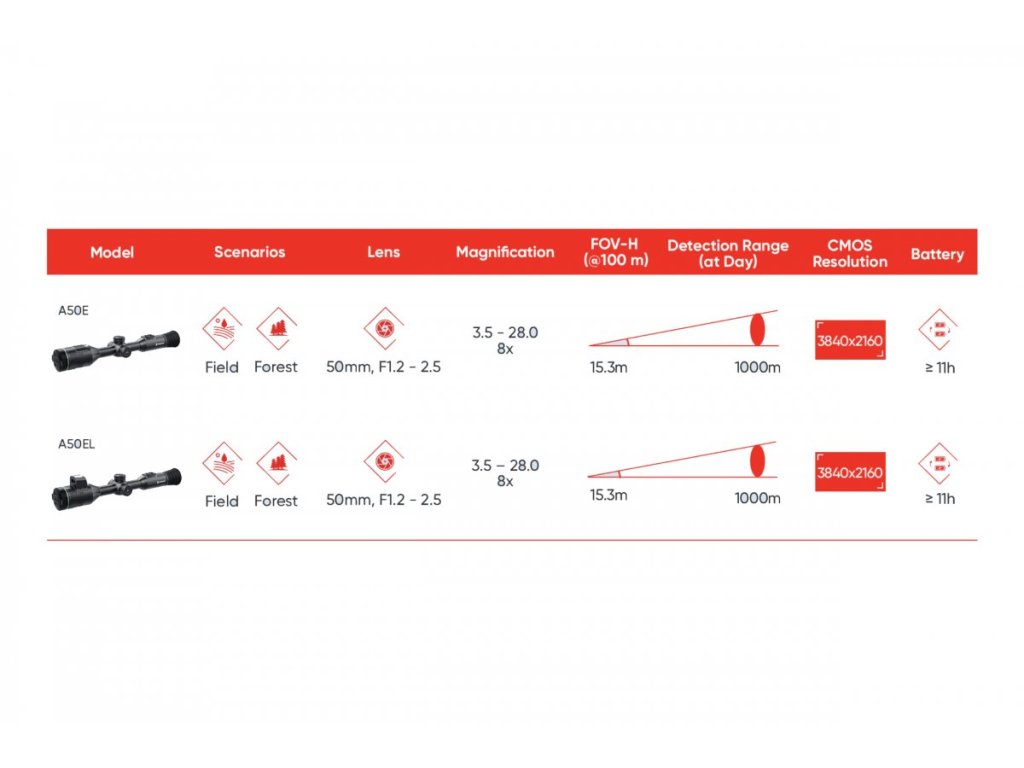 Výbornou vychytávkou zaměřovače ALPEX 4K A50E je variabilní clona objektivu v rozsahu F1,2 až F2,5, která zajišťuje lepší rozpoznávání cílů v různých světelných podmínkách. Při nastavení na vyšší hodnotu F2,5 účinně eliminuje přesvětlení a zároveň zvyšuje hloubku ostrosti – ideální vlastnost pro denní lov.