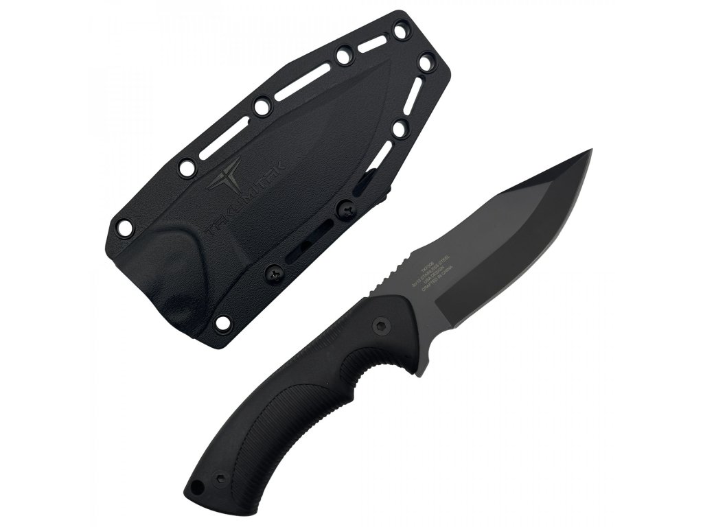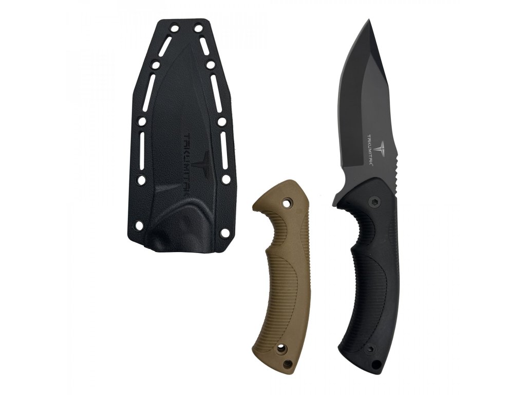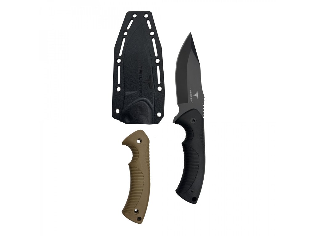 Tento nůž se pyšní odolnou, 3,76 mm silnou čepelí z černěné nerezové oceli 3Cr13, která je připravena na náročné úkoly. Užijte si flexibilitu díky dvěma dodávaným rukojetím (černá a písková), obě zhotoveným z vyztuženého nylonu FRN – materiálu známého svou lehkostí a extrémní odolností. Bezpečné nošení zajišťuje pouzdro ze stejného FRN materiálu, vybavené sponou na opasek a plně kompatibilní s MOLLE systémem pro snadnou integraci do vaší výbavy.