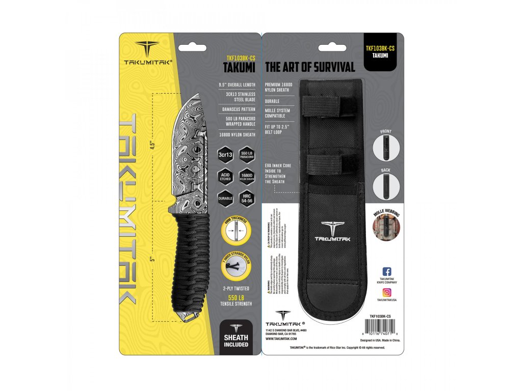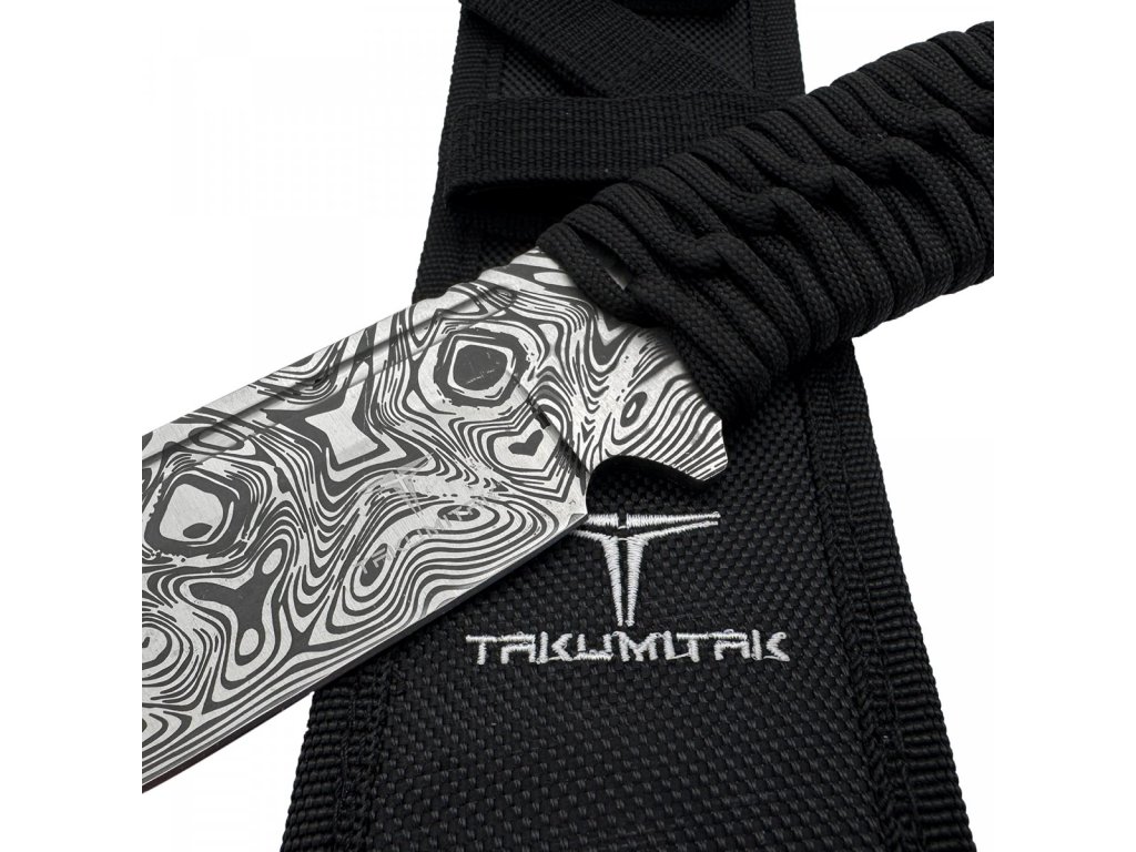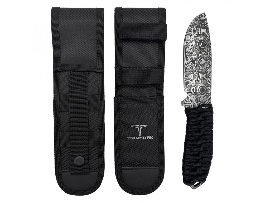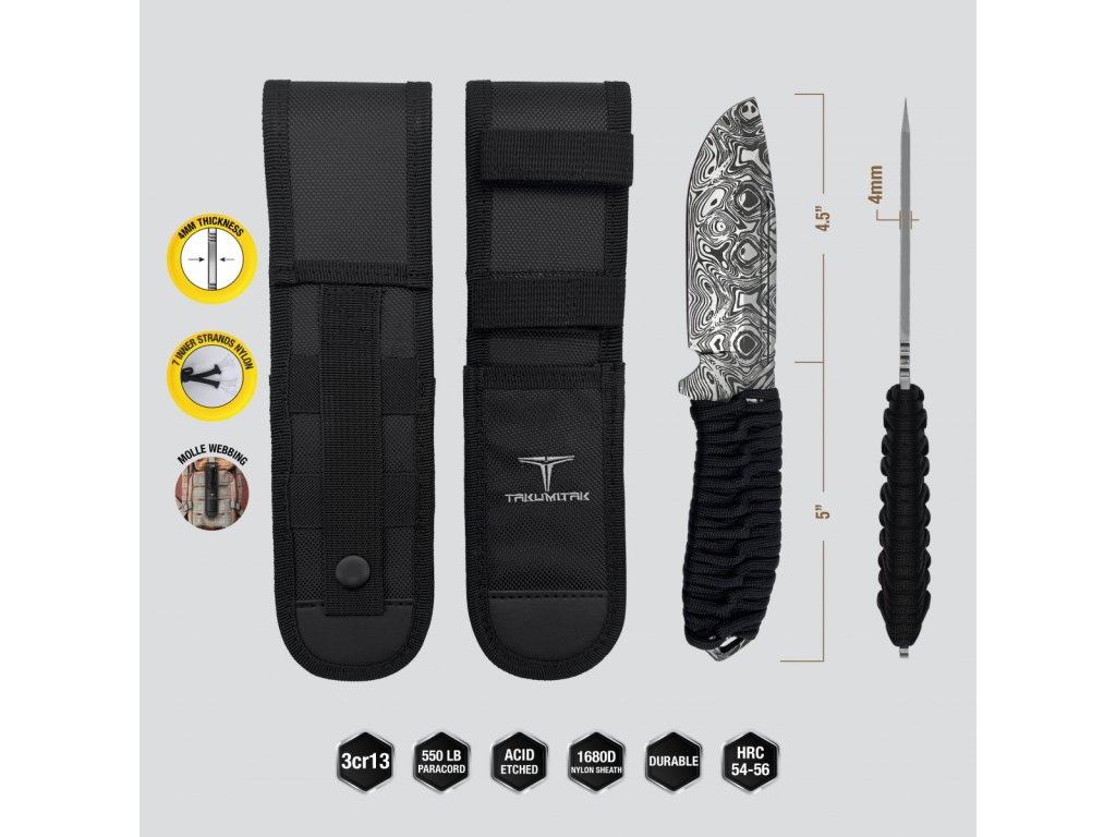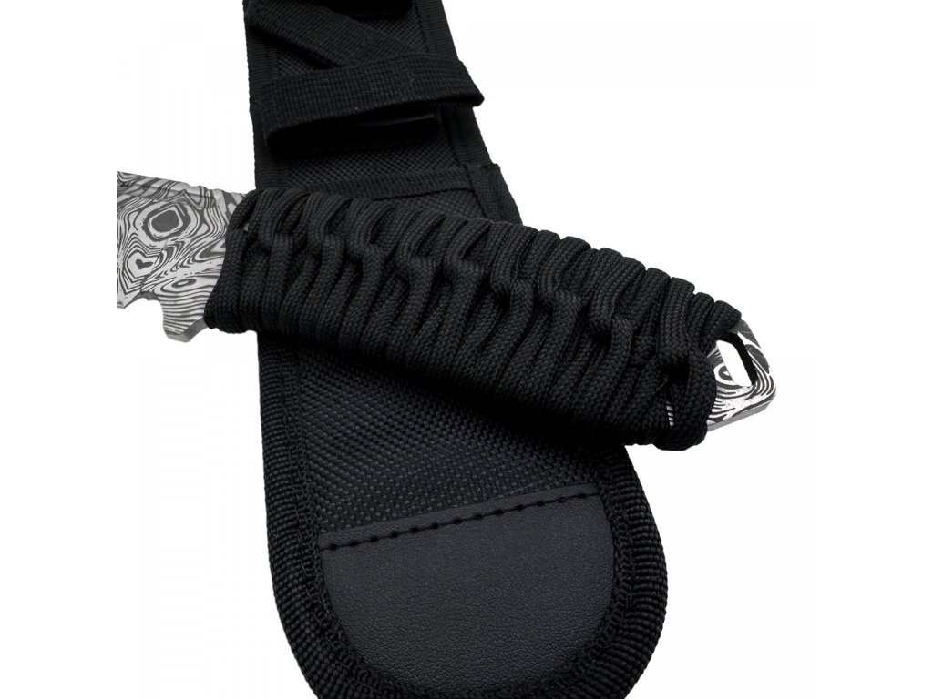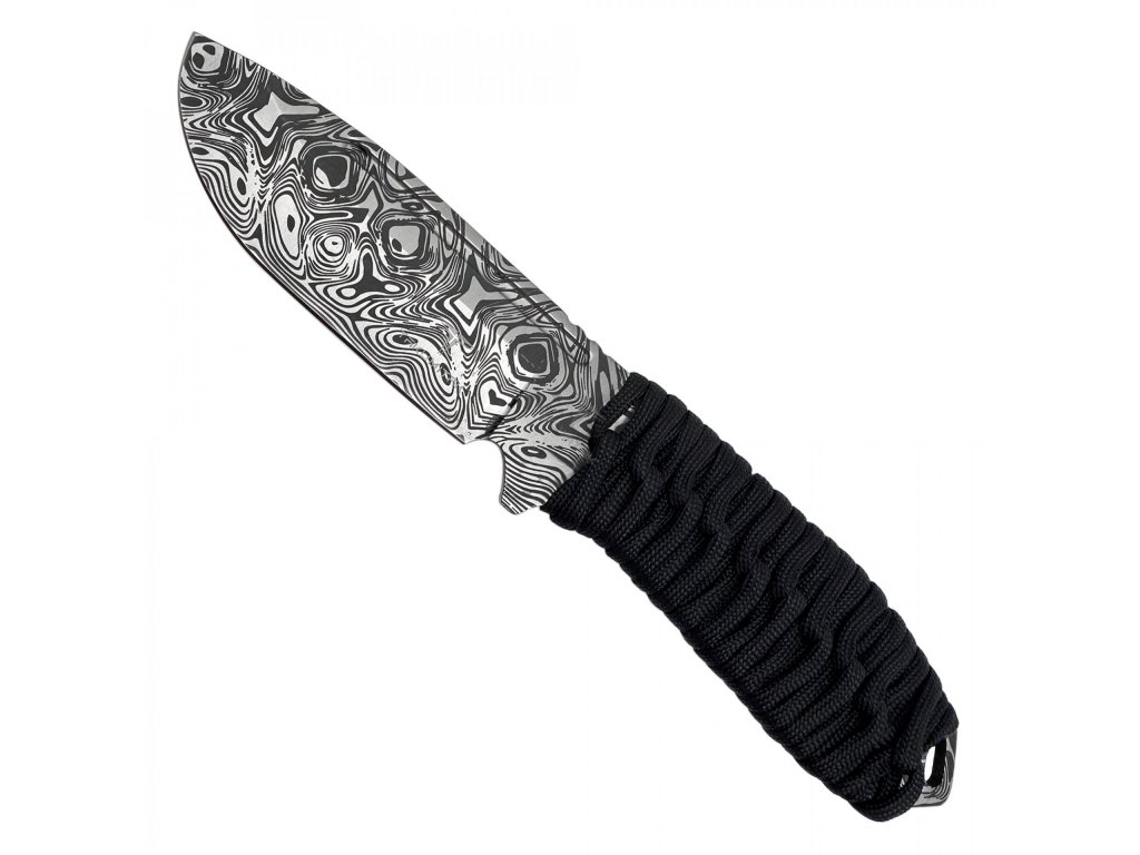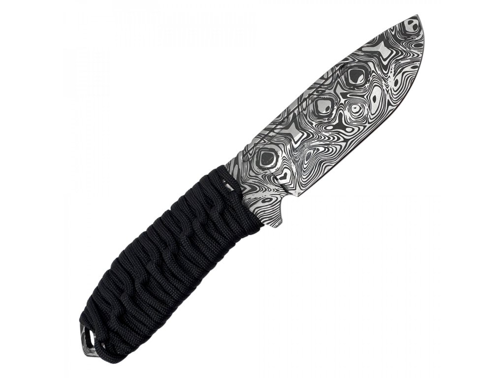 Tento nůž má pevnou čepel z nerezové oceli 3Cr13 o tloušťce 3,95 mm, která je opatřena leptanou povrchovou úpravou věrně imitující damaškovou ocel. Rukojeť je omotána paracordem 550, což zajišťuje velmi pohodlný a spolehlivý úchop. Zároveň můžete paracord v případě potřeby rozmotat a použít. K noži dostanete také pouzdro z nylonu 1680D, které je kompatibilní se systémem MOLLE.