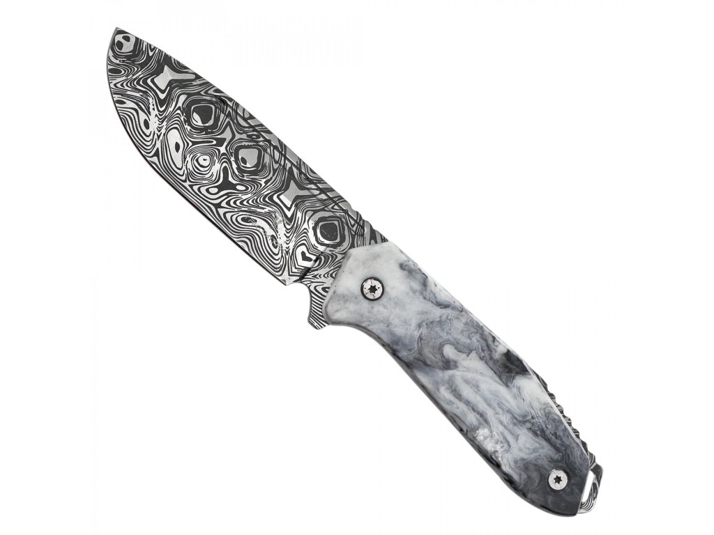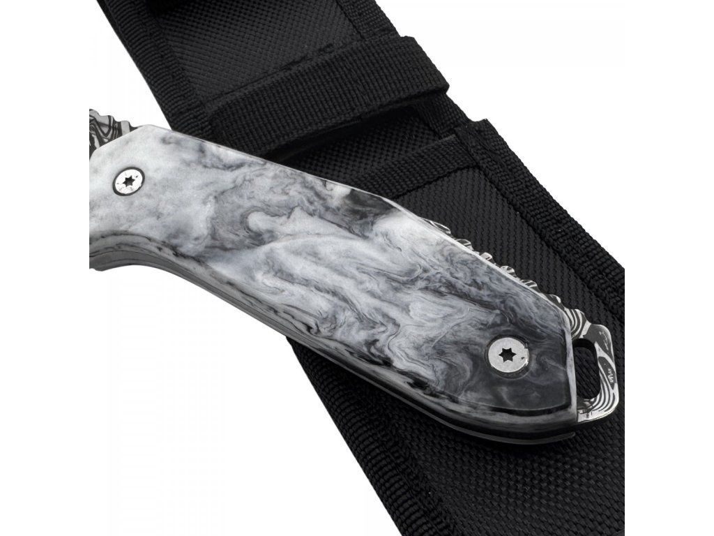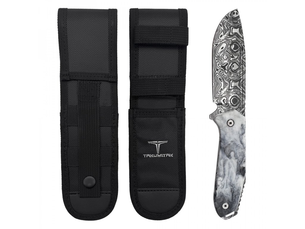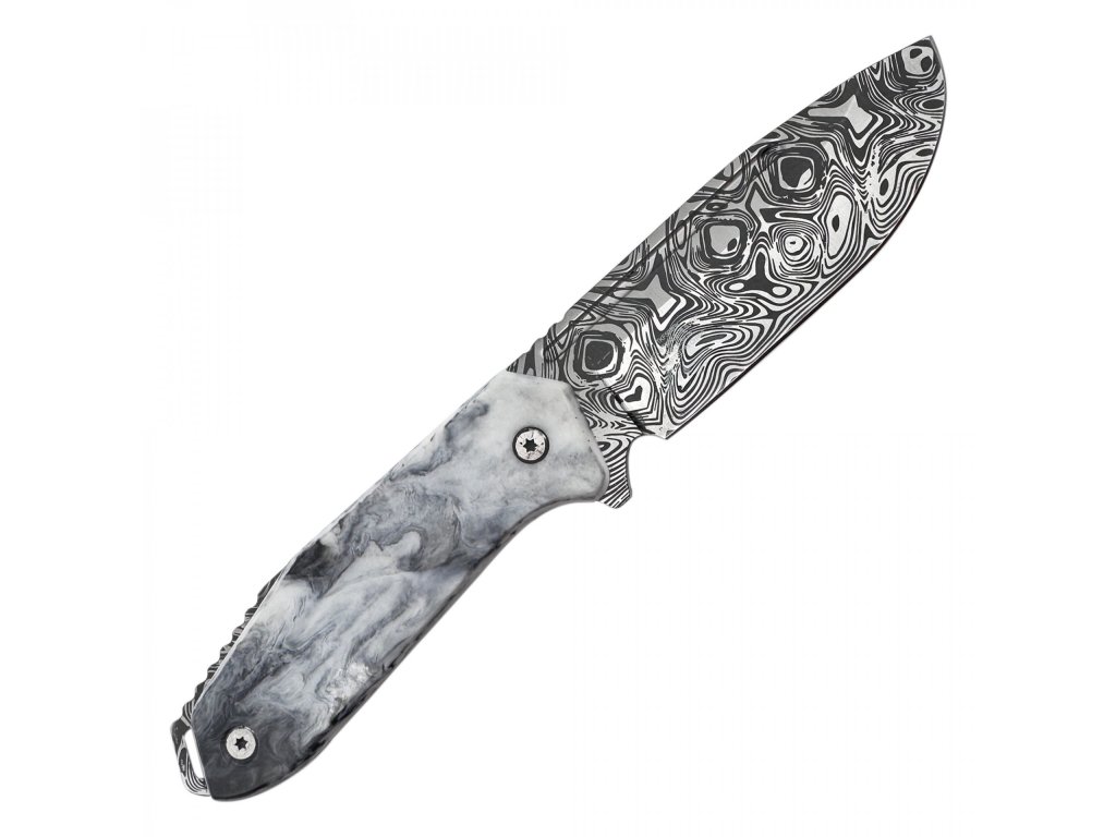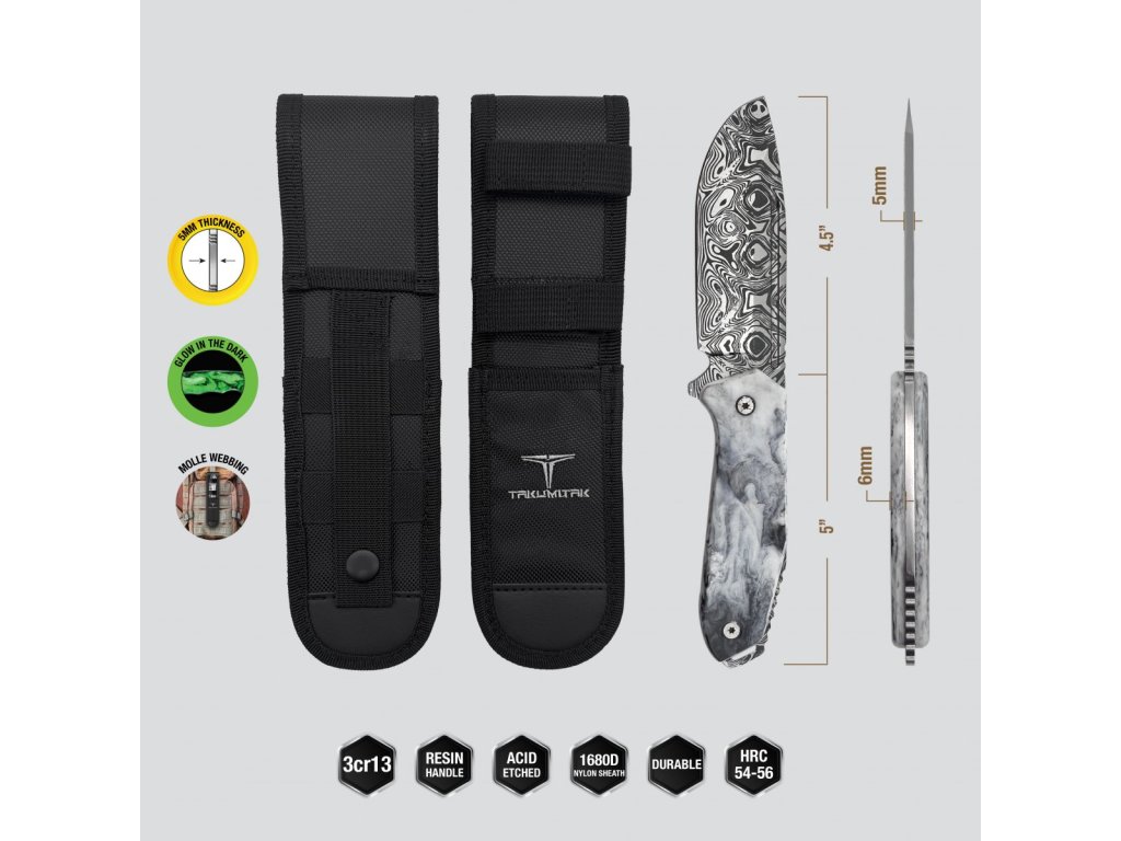 Představujeme vám nůž s impozantní, 3,95 mm silnou čepelí z nerezové oceli 3Cr13, jejíž leptaná povrchová úprava s mistrovskou přesností imituje damaškovou ocel. Rukojeť, zhotovená z luminiscenční pryskyřice s elegantním kouřovým zabarvením, vás okouzlí nejen vzhledem, ale i praktičností. K noži samozřejmě patří i pouzdro z nylonu 1680D, plně kompatibilní se systémem MOLLE.