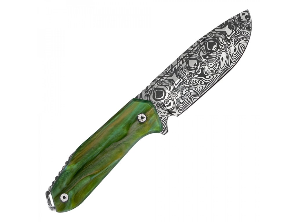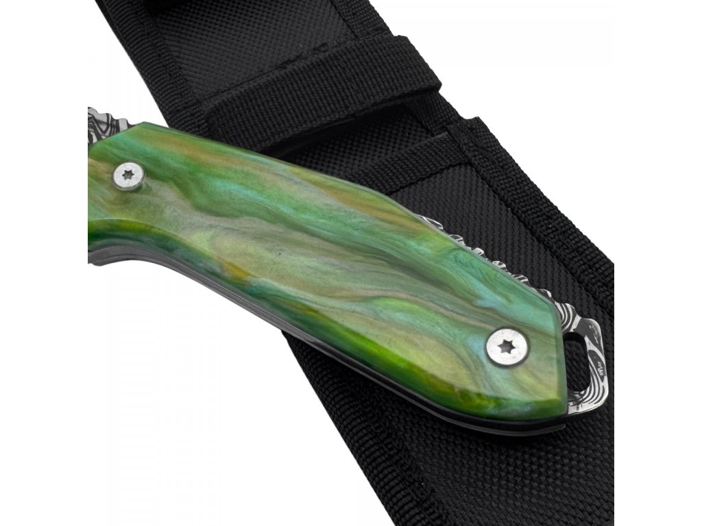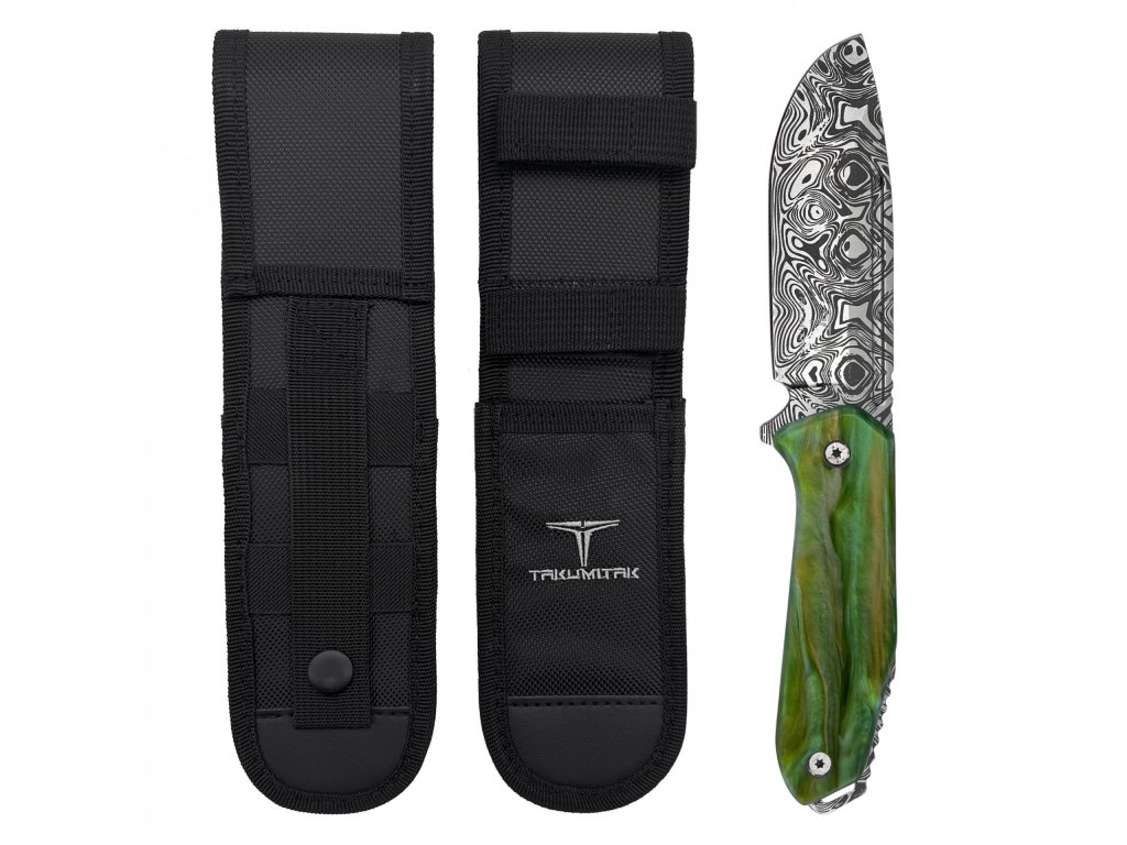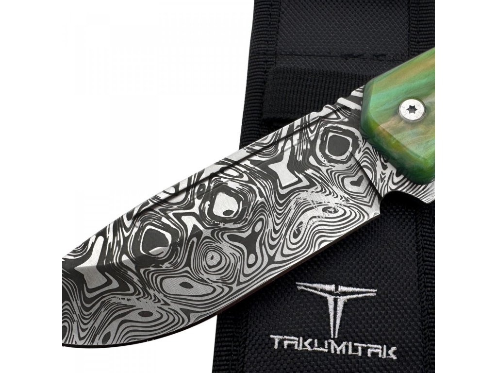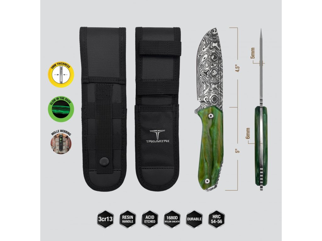Představujeme vám nůž s impozantní, 3,95 mm silnou čepelí z nerezové oceli 3Cr13, jejíž leptaná povrchová úprava s mistrovskou přesností imituje damaškovou ocel. Rukojeť, zhotovená z luminiscenční pryskyřice s elegantním kouřovým zabarvením, vás okouzlí nejen vzhledem, ale i praktičností. K noži samozřejmě patří i pouzdro z nylonu 1680D, plně kompatibilní se systémem MOLLE.